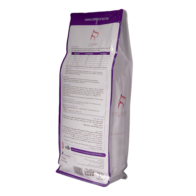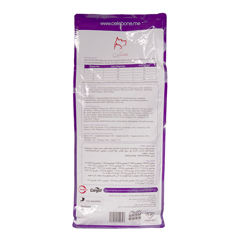 وزن این محصول حدود 2500 گرم است و مخصوص گربههای بالغ عقیم شده با وزن بین 2 تا 6 کیلو مناسب است. گفتنی است که با مکملهایی مثل برنج، تخم مرغ از افزایش وزن گربه جلوگیری میکند. افزودنیهای این محصول شامل ویتامینهای B1، B12، C، D، پروبیوتیک، امگا 3-6 و الکارنتین است که برای تقویت ماهیچه و قلب گربه بسیار مفید است. این رژیم غذایی خوشمزه و کامل فقط حاوی 10% چربی بوده، اما حاوی مقدار زیادی از پروتئینهای مغذی از مرغ و منبع بالایی از ویتامینهای گروه b است که همراه منبع بالای فیبر محلول برای تنظیم سیستم گوارش برای هضم آسان و بهبود سلامت مو و استخوانها بسیار مناسب است. همچنین از مزهی خوبی برخوردار است و یک غذای کامل برای گربههای شما را فراهم میکند. پروتئین و طعم اصلی غذای خشک گربه سلبن مرغ است.
