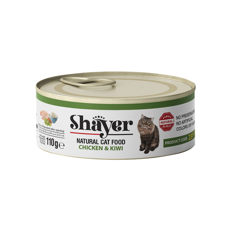 کنسرو غذای گربه با طعم مرغ و کیوی در ژله شایر Shayer Natural With Chicken & Kiwi in Jelly وزن 110 گرم